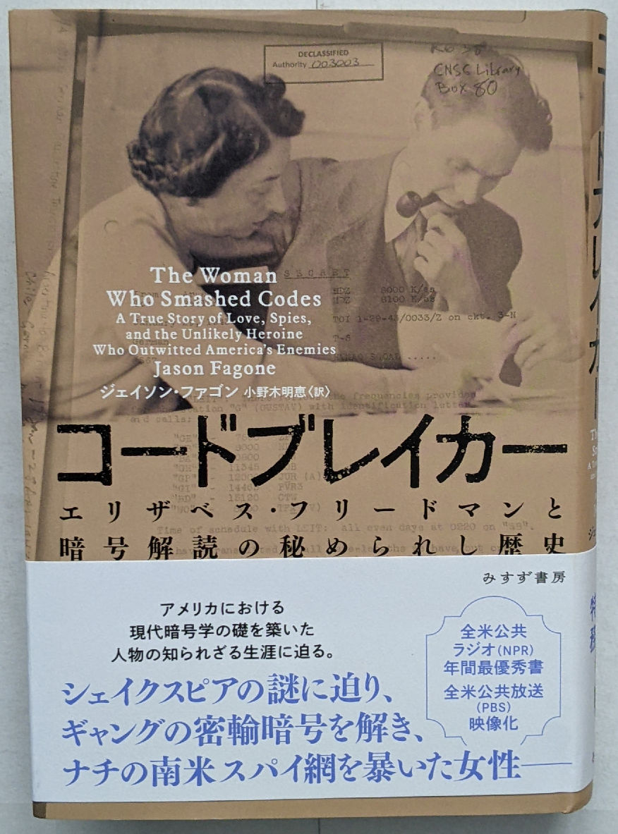 Japanese edition (translated from English to Japanese by Akie Onogi) of "The Woman Who Smashed Codes - A True Story of Love, Spies, and the Unlikely Heroine Who Outwitted America's Enemies" (496 pages) by Jason Fagone, 2024. Publisher: Misuzu Shobo. I have a hardcover copy in my collection. |