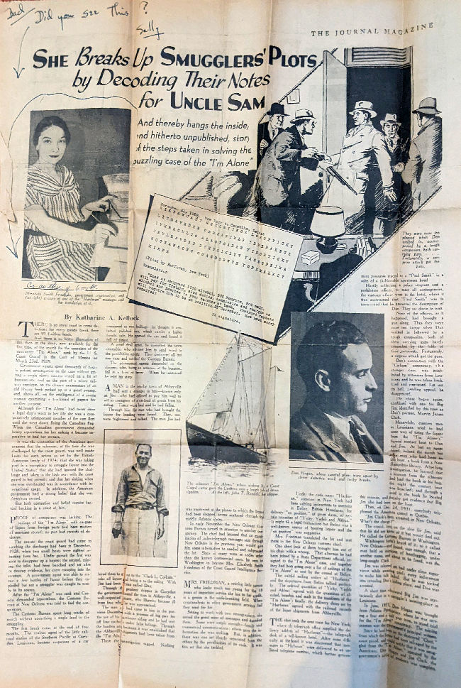 Article - "She Breaks Up Smugglers' Plots by Decoding Their Notes for Uncle Sam" - 22 July 1934 Journal Magazine by Katharine A. Kellock. Also appeared at the same time in the New Orleans Times Picayune. |