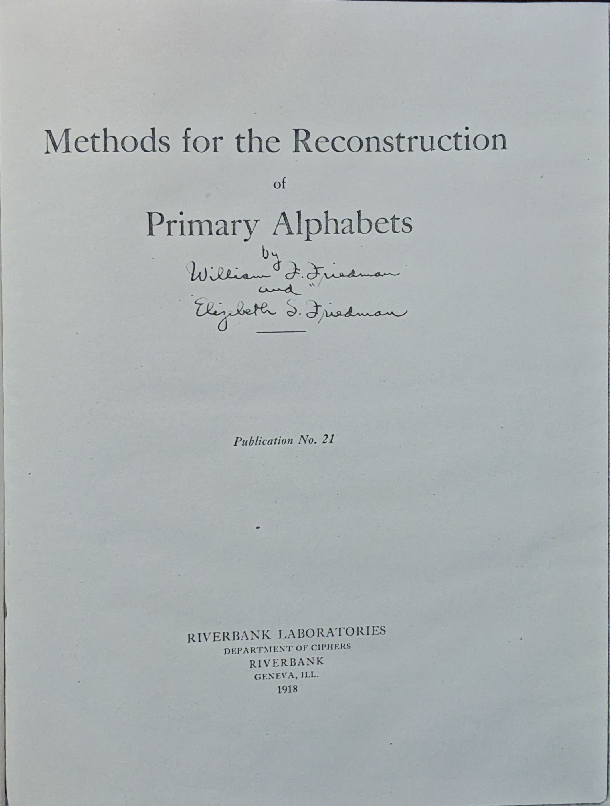 Book - "Publication No. 21: Methods for the Reconstruction of Primary Alphabets" (72 pages) by Elizebeth Friedman and William Friedman, 1918, Riverbank Laboratories. I have a hardcover "photostated" copy in my collection - the book has a paste down label on the inside cover indicating this was once in the "Ken Powell" collection. |