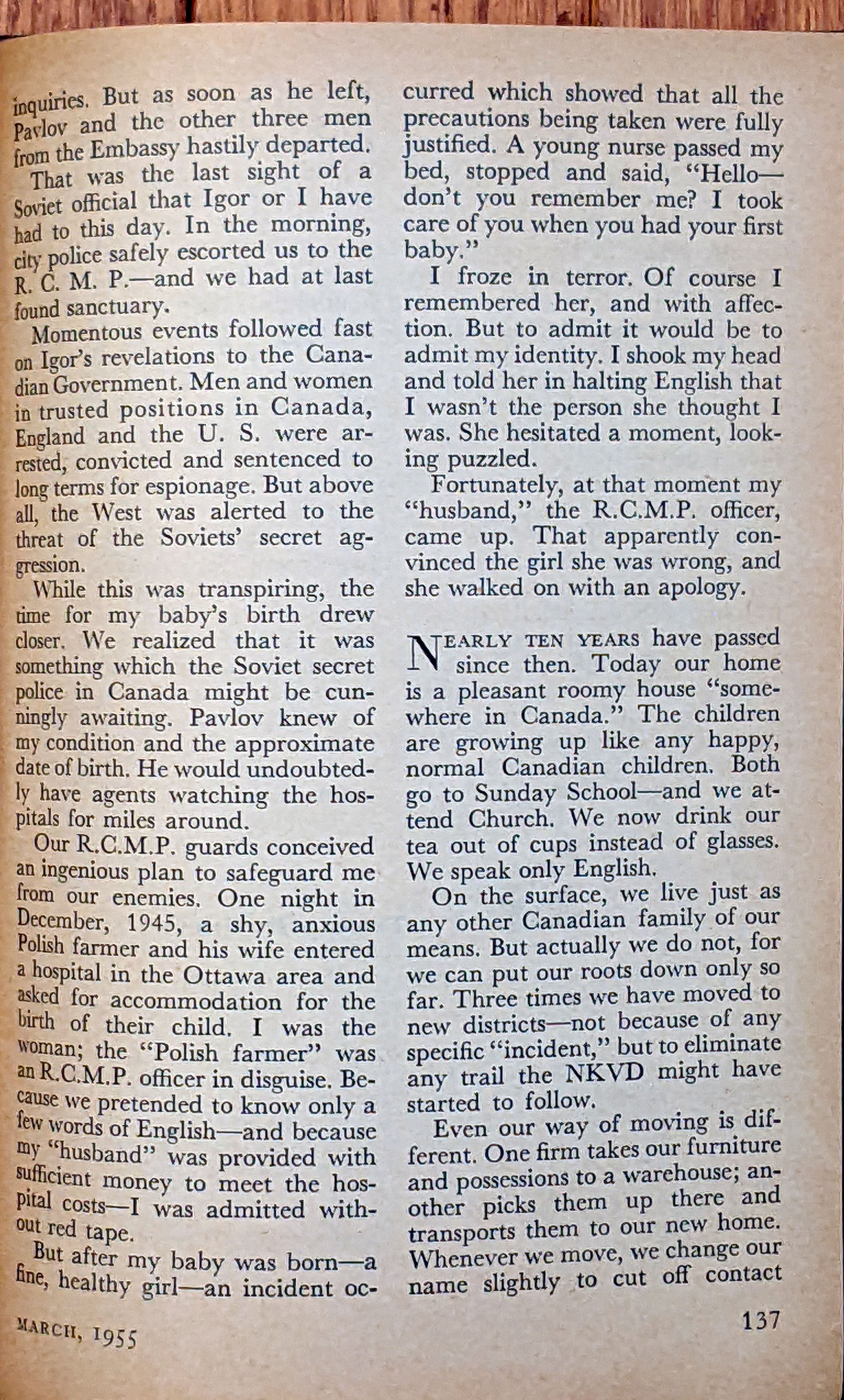 This was an 10-page article (by Lana Gouzenko as told to Anne Fromer) in the Coronet March 1955 magazine. The foreword is as follows: "Drama and fear must forever walk hand in hand with this exiled Russian family" Here are all pages scanned for your reading benefit: |