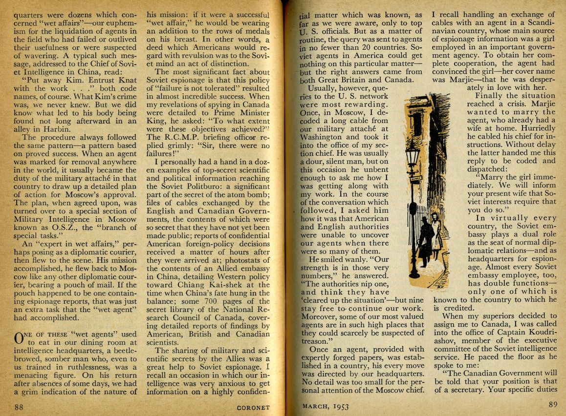 This was an 8-page article (by Igor Gouzenko as told to Anne Fromer) in the Coronet magazine. The foreword is as follows: "Late one night in the code room of Soviet spy headquarters for North America, Igor Gouzenko put a carefully prepared plan into action. He slipped 109 secret documents into the lining of his coat. Then he walked out of the building - the Soviet Embassy in Ottawa - for the last time. Why did Gouzenko voluntarily change his allegiance to democracy? What single incident convinced him that the Soviet cause he was serving was false? In this article, are the answers. Here, for the first time, Igor Gouzenko tells the story of one of the most sinister adventures of our time" - The Editors." Here are all pages scanned for your reading benefit: |
