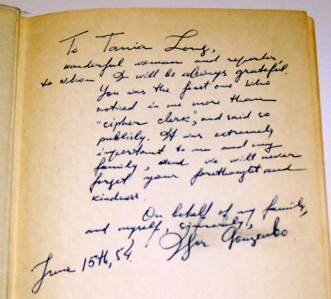 This is a special copy of "The Fall of a Titan" with the following signed inscription by Igor Gouzenko: "To Tania Long, Wonderful woman and reporter to whom I will be always grateful. You were the first one who noticed in me more than "cipher clerk", and said so publicly. It was extremely important to me and my family, and we will never forget your forethought and kindness. On behalf of my family, and myself, sincerely, Igor Gouzenko (dated June 15th, 1954)." In regards to Tania Long, she wrote a feature article on Igor Gouzenko in the The New York Times Book Review issue of 18 July 1954 (see further below). |