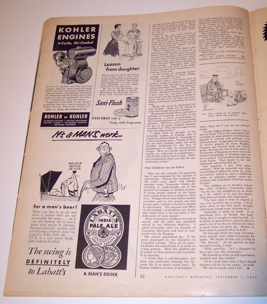 This issue (20 Nov 1954) of The Standard Weekend Magazine contains an article about Igor Gouzenko. | Here are some scans of the page with the article in question along with portions of the article: