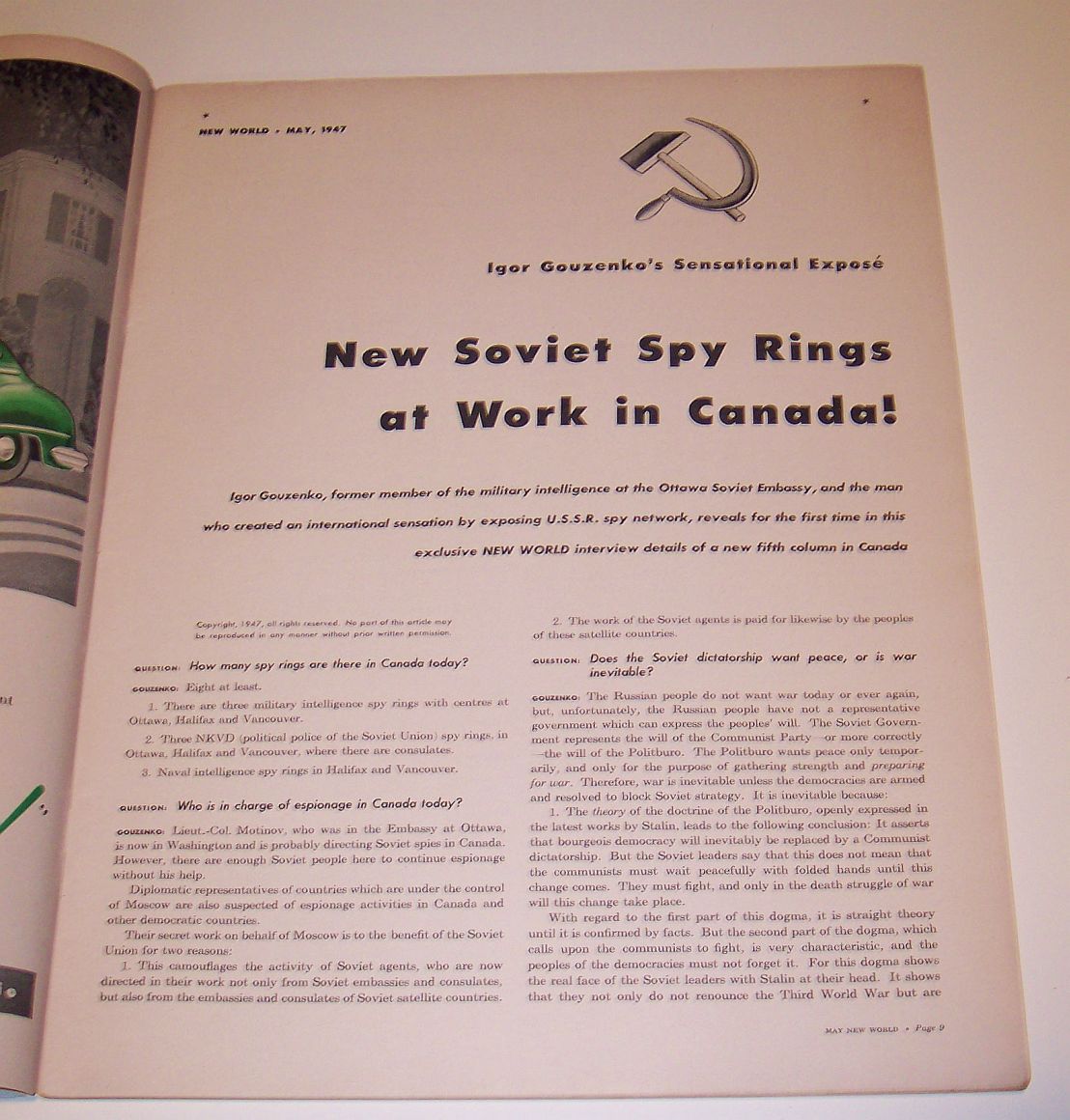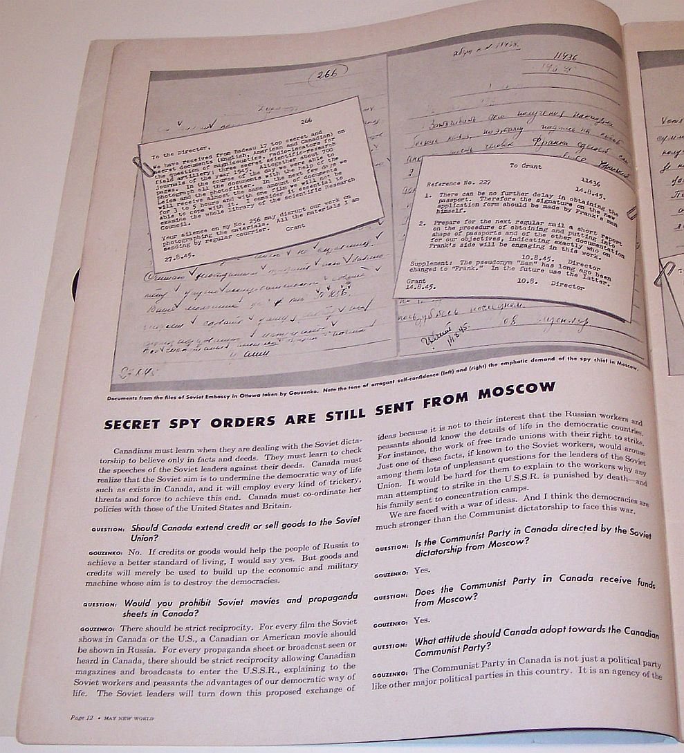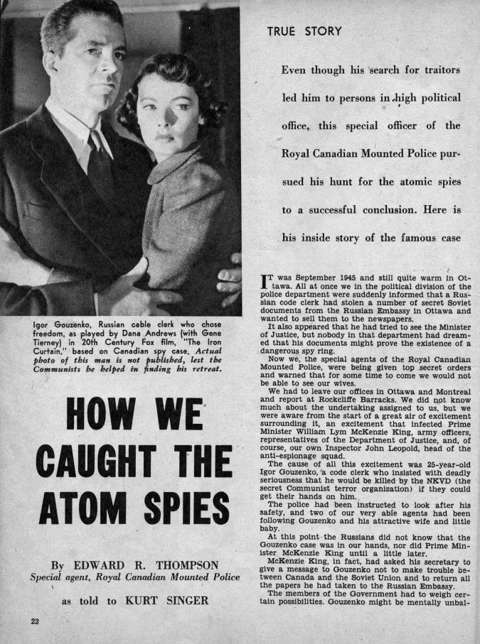 This magazine includes an article titled "How We Caught the Atom Spies" by Edward R. Thompson (Special Agent, RCMP) "as told to Kurt Singer". The article is covered on pages 22-23 and 46-47. Here is a scan/photo of the first page of the article which includes a photo from the movie "The Iron Curtain" featuring Dana Andrews and Gene Tierney. Here is an excerpt from the article: ... It was September 1945 and still quite warm in Ottawa. All at once we in the political division of the police department were suddenly informed that a Russian code clerk had stolen a number of secret Soviet documents from the Russian Embassy in Ottawa and wanted to sell them to the newspapers. It also appeared that he had tried to see the Minister of Justice, but nobody in that department had dreamed that his documents might prove the existence of a dangerous spy ring. Now we, the special agents of the Royal Canadian Mounted Police, were being given top secret orders and warned that for some time to come we would not see our wives. We had to leave our offices in Ottawa and Montreal and report at Rockliffe Barracks. We did not know much about the undertaking assigned to us, but we were aware from the start of a great air of excitement surrounding it, and excitement that infected Prime Minister William Lym (sic) McKenzie King, army officers, representatives of the Department of Justice, and of course, our own Inspector John Leopold, head of the anti-espionage squad. The cause of all this excitement was 25-year old Igor Gouzenko, a code clerk who insisted with deadly seriousness that he would be killed by the NKVD (the secret Communist terror organization) if they could get their hands on him. The police had been instructed to look after his safety, and two of our very able agents had been following Gouzenko and his attractive wife and little baby. At this point the Russians did not know that the Gouzenko case was in our hands, nor did Prime Minister McKenzie King until a little later. McKenzie King, in fact, had asked his secretary to give a message to Gouzenko not to make trouble between Canada and the Soviet Union and to return all the papers he had taken to the Russian Embassy. The members of the Government had to weigh certain possibilities. Gouzenko might mentally unbalanced. He might be a crank. He might even be an agent provocateur. We special agents quickly knew better. We learned that the Soviet Embassy was calling for special action, and soon afterwards Soviet agents raided Gouzenko's home at 511 Somerset Street, Ottawa. ... What we had to start with were hundreds of documents in Russian. First of all, we got an expert Russian translator, a person we could trust, to translate these documents. They were full of technical terms, so we had to turn to scientists to explain to us the terms. Even then they were hard to understand. Meanwhile, Inspector Leopold was begging us to hurry our investigation, for it was Leopold's duty to brief Prime Minister McKenzie King on what was being turned up, and the Prime Minister in turn was informing the Canadian Government, the Government of Britain, and the United States Government. Finally, after much sifting of the documents and after interrogating Gouzenko day and night, we concluded that a Russian-Canadian-Communist spy ring with ramifications in the United States had been able to obtain information on matters that were most vital to the Western Hemisphere. In tabular form, these matters were: