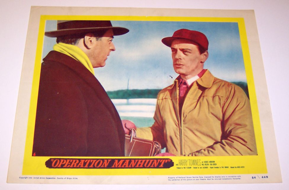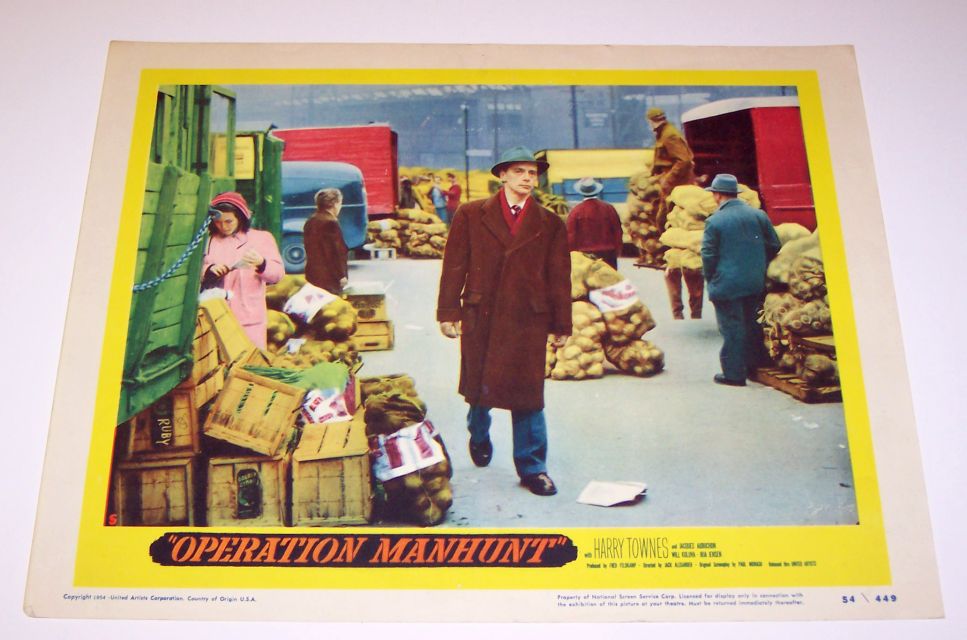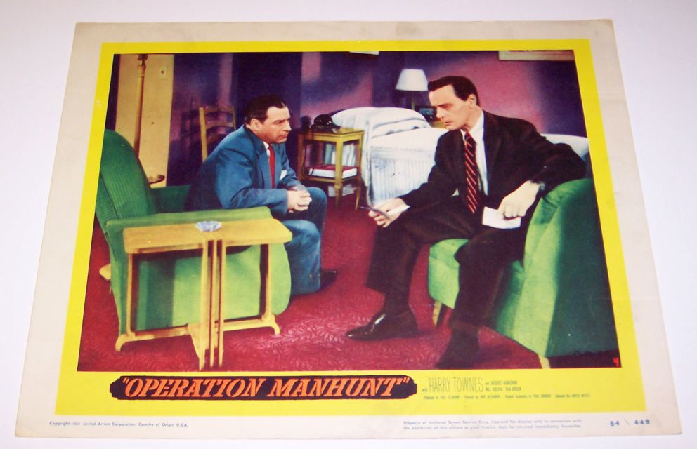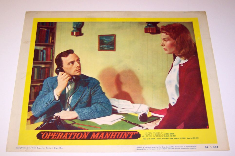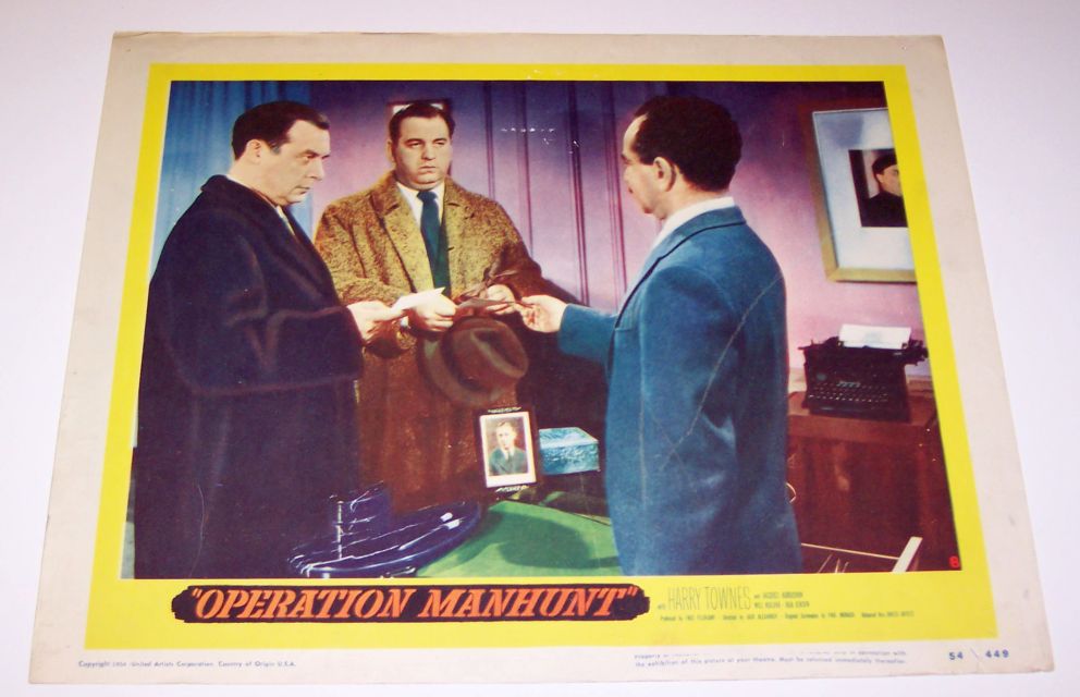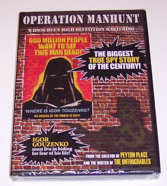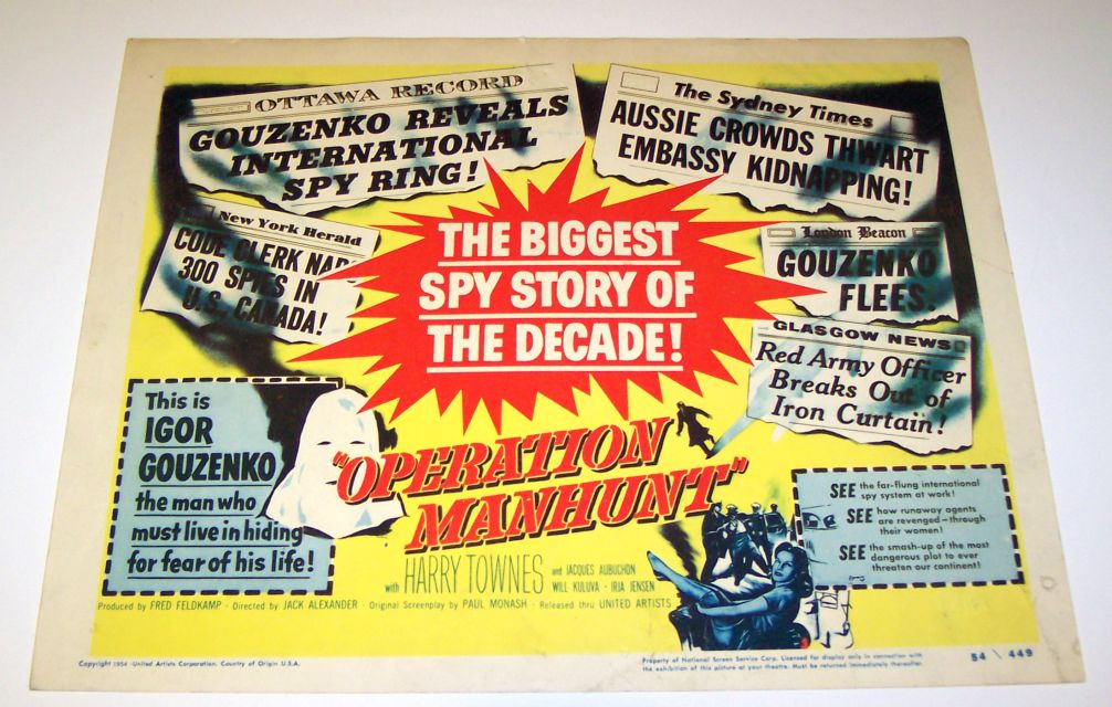 "Operation Manhunt" (78 minutes DVD) - Originally aired in 1954. | United Artists movie production in 1954. Caption included "This movie is the authentic, documented story of Igor Gouzenko, the former Russian code clerk whose sensational revelations smashed a giant Soviet espionage ring. Gouzenko, Target Number One on the Soviet Secret Service list, was forced to live in hiding, but secretly appeared in this feature film wearing a hood." Here are color photos of "Operation Manhunt" lobby cards from my collection: