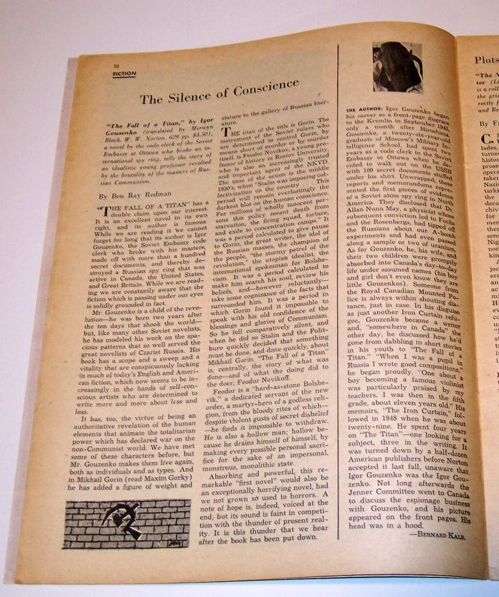 Magazine article on the new release of Igor Gouzenko's new book "The Fall of a Titan". The cover of the magazine has a photo in which the manacled hands symbolize the bleak enslavement of honor and culture behind the Iron Curtain, the theme of Igor Gouzenko's new panoramic novel, "The Fall of a Titan". Here is a scan of the page (10) featuring the article. There is also a column on the author Igor Gouzenko written by Bernard Kale: The Author Igor Gouzenko began his career as a front-page disgrace to the Kremlin in September 1945, only a month after Hiroshima. Gouzenko, a twenty-six-year-old graduate of Moscow's Military Intelligence School, had spent two years as a code clerk in the Soviet Embassy in Ottawa when he decided to walk out on the USSR with 109 documents stuffed under his shirt. Unwrapped, these reports and memorandums represented the first pieces of evidence of a Soviet atom spy ring in North America. They disclosed that Dr. Allan Nunn May, a physicist whose subsequent conviction led to Fuchs and the Rosenbergs, had tipped off the Russians about our A-bomb experiments and had even passed along a sample or two of uranium. As for Gouzenko, he, his wife and their two children were promptly absorbed into Canada's day-to-day life under assumed names (his boy and girl don't even know they are little Gouzenkos). Someone from the Royal Canadian Mounted Police is always within shouting distance, just in case. In his disguise, as just another Iron Curtain refugee, Gouzenko became a writer and, "somewhere in Canada" the other day, he discussed how he'd gone from dabbling in short stories in his youth to "The Fall of a Titan". "When I was a pupil in Russia I wrote good compositions," he began proudly. "one about a boy becoming a famous violinist was particularly praised by my teachers. I was then in the fifth grade, about eleven years old." His memoirs, "The Iron Curtain", followed in 1948 when he was about twenty-nine. He spent four years on "The Titan" - one looking for a subject, three in the writing. It was turned down by a half-dozen American publishers before Norton accepted it last fall, unaware that Igor Gouzenko was the Igor Gouzenko. Not long afterwards the Jenner Committee went to Canada to discuss the espionage business with Gouzenko, and his picture appeared in the front pages. His head was in a hood. |
